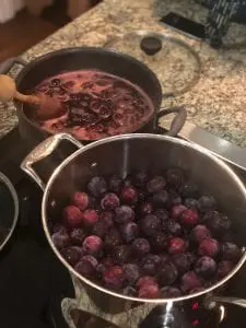 First things first…you need a good recipe. The one we use was given to us from a family friend named Geraldine. Rule #1: You can ALWAYS trust a recipe from someone named Geraldine. It’s the kind of recipe that doesn’t have exact measurements and was hand written by the recipe giver. Those are the best kinds. After getting our fruit picked, our first step was to create the juice. We used a couple of pans full of ripe plums and filled about 1/3 of the way with water. The more water you use, the less plum flavor you will have in the juice. Cook that until the water boils and the plums get mushy.