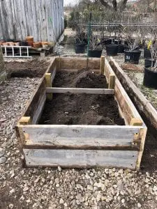 To address all these issues, we demolished the old raised beds and reused that wood to make a 4’ wide x 10’ long x 2’ high raised bed. Next to it, we built a brand new bed 4’ wide x 10’ long x 37” high. The higher raised bed solves the issue of rabbits because they can’t climb. It’s also a good option for older gardeners who can’t (or would rather not) bend over to tend a ground-level garden. It’s also an option for those with small children or large dogs, as it will keep the vegetables safe from trampling by little feet or big paws.